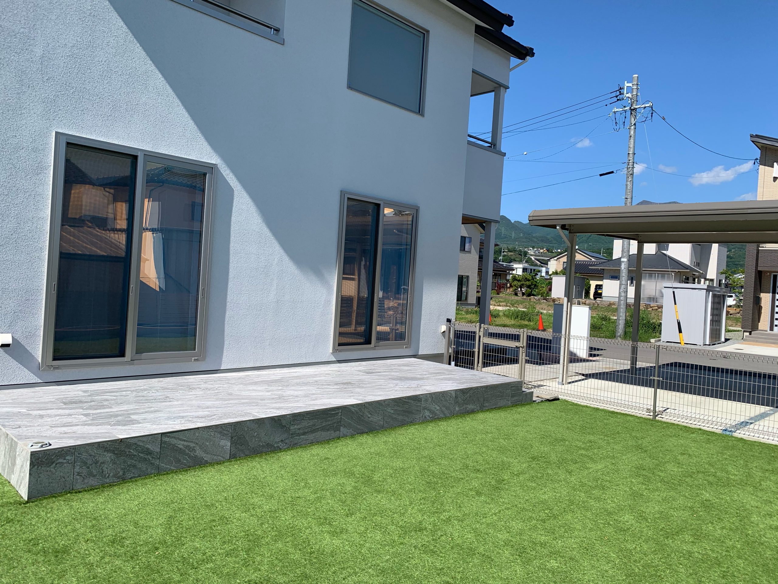 愛犬が飛び出さない為のフェンスを設置し、雨や雪の日でも一年中楽しく遊べるように人工芝をひかせていただきました。